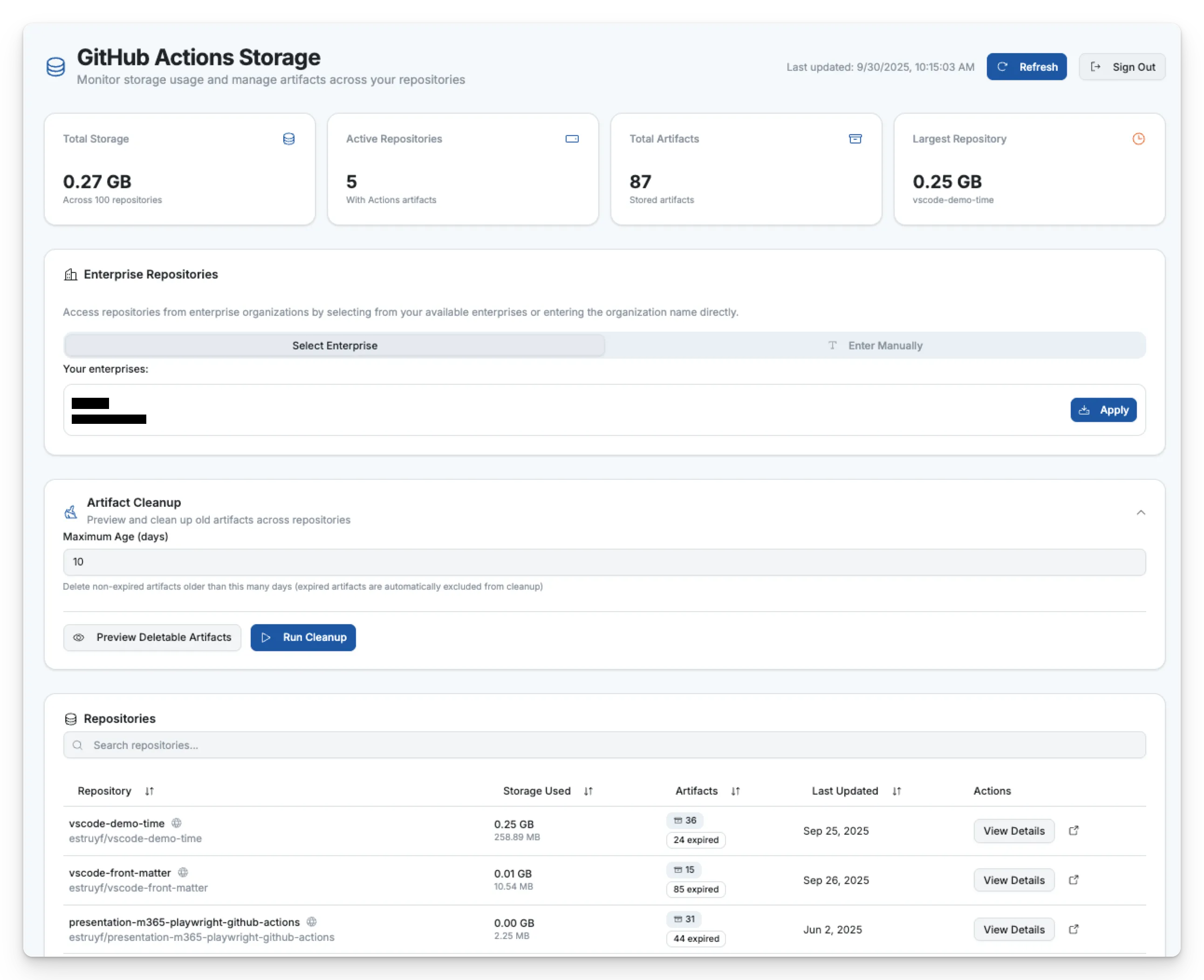 Another day, another email from GitHub telling me I’m running out of GitHub Actions storage. Sound familiar? If you’ve been managing multiple repositories with CI/CD workflows, you’ve probably experienced this pain too. GitHub doesn’t provide a comprehensive dashboard to visualise artefact storage across all your repositories, making it nearly impossible to understand where your storage is being consumed.