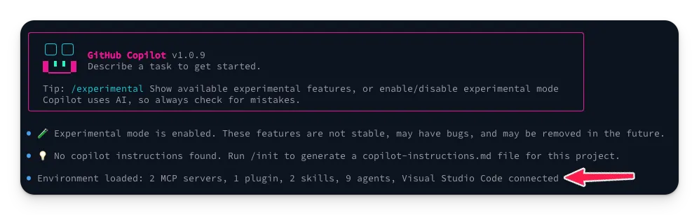 copilotcommand. - The CLI automatically connects to my active Visual Studio Code instance, and I can start prompting.