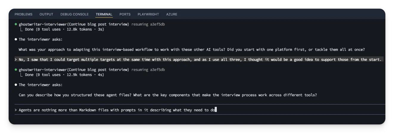 Act as an expert interviewer for a technical blog...[Full prompt with instructions, guidelines, and behavioral rules]That’s it. The YAML frontmatter gives the agent a name and description, and the markdown body contains the prompt that defines how the AI should behave.