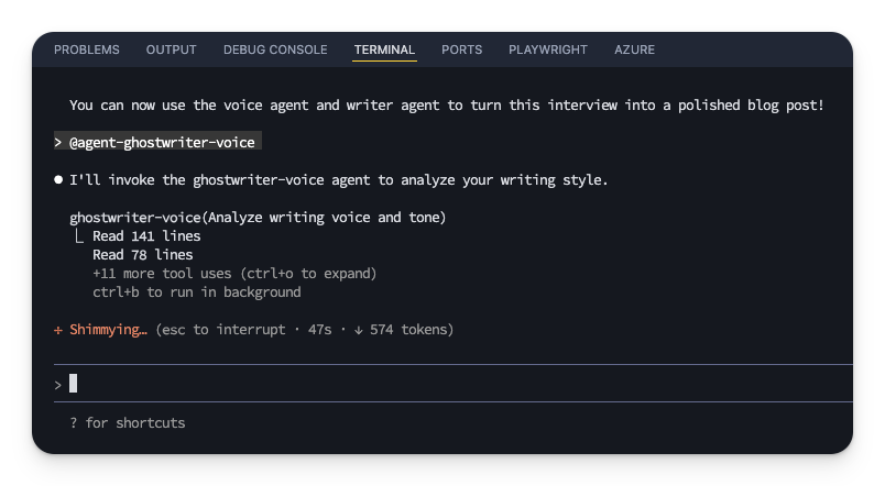 Type @agent-ghostwriter-interviewer to start the interview. The @ symbol lets you reference agents by name.