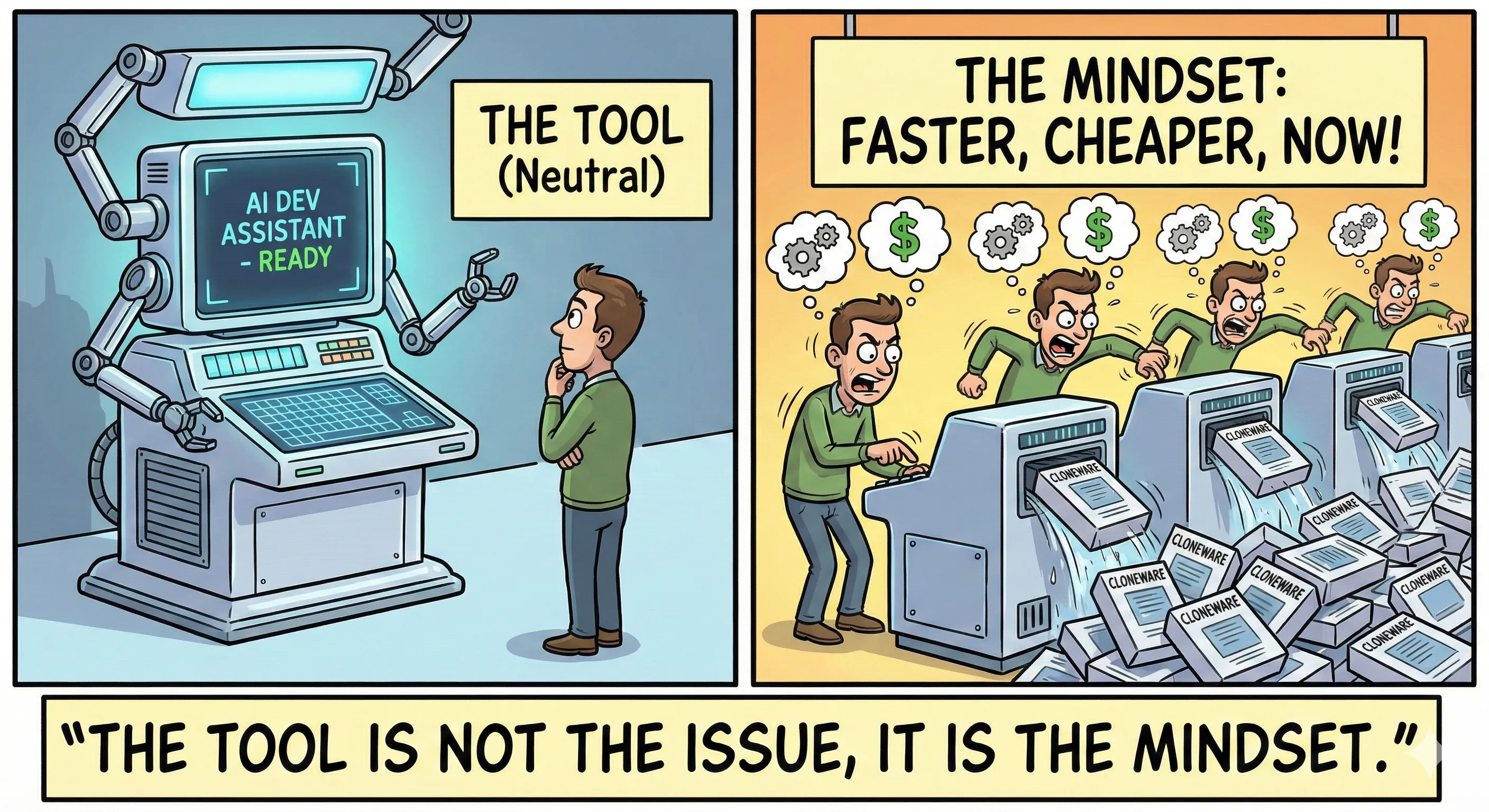 On the surface, this looks like freedom. But look a little deeper. That $15 tool you just cloned? It was likely built by another indie developer. Someone who spent months thinking about edge cases, designing the interface, writing documentation, and supporting users. By cloning it just because you can, you aren’t just saving $15; you are actively devaluing the craft of independent software development and the livelihood of the person behind it.